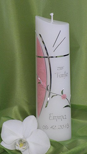 Taufkerze/Kommunionkerze in Rosa und Silber ; mit einem schrägen, silbernen Kreuz und einer Blütenranke ; Kerzengröße: 21 x 6 x 3,5 cm, Grundform oval, in creme-weißJede Taufkerze wird individuell nach ihrer Bestellung für sie in Handarbeit angefertigt !
