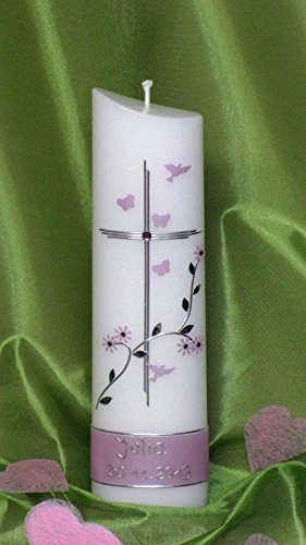 Taufkerze/Kommunionkerze mit einem silbernen Kreuz und Schmetterlingen und Tauben, in Flieder ; Kerzengröße: 21 x 6 x 3,5 cm, Grundform oval, in creme-weißJede Taufkerze wird individuell nach ihrer Bestellung für sie in Handarbeit angefertigt !