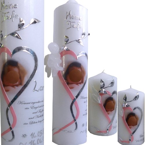 Verkauf Taufkerze 250x60 Mädchen Junge Herz Engel mit Foto Taufspruch Ihres Kindes Mit Namen und Datum Mit 2 PATENKERZEN rosa silber ITP02